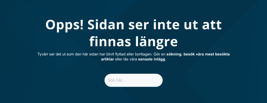 Något som inte är särskilt positivt varken för användaren eller dina positioner i sökmotorerna. För att inte råka ut för detta problem gäller det att lokalisera eventuella 404-sidor och sedan omdirigera dem till en annan liknande sida. I ”värsta fall” kan du göra en omdirigering till startsidan.