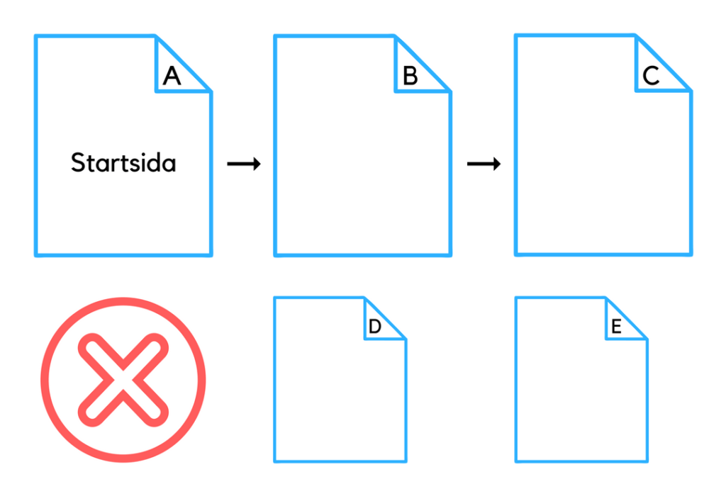Här kan du se ett exempel på en dålig länkstruktur. I detta exempel kan du se hur Googles spindlar har hittat till sida A, vilket är din startsida. De märker också att sida A länkar till sida B och C. Eftersom inga länkar däremot pekar till sidorna D och E har spindlarna ingen möjlighet att hitta dessa sidor, eller ens veta att de existerar.